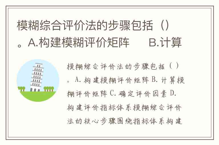 模糊综合评价法的核心步骤围绕指标体系构建与模糊矩阵运算展开,具体包括:确定评价因素集(指标体系)、构建模糊评价矩阵、计算综合评价结果等关键环节。以下是对题目选项的分析及完整步骤解析: