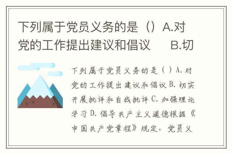下列属于党员义务的是()A.对党的工作提出建议和倡议 B.切实开展批评和自我批评 C.加强理论学习 D.倡导共产主义道德