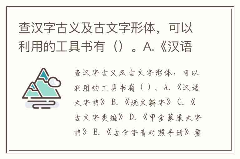 查汉字古义及古文字形体,可以利用的工具书有()。A.《汉语大字典》 B.《说文解字》 C.《古文字类编》 D.《甲金篆隶大字典》 E.《古今字音对照手册》