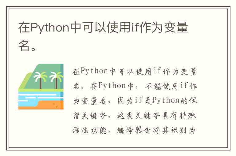 在Python中,不能使用if作为变量名,因为if是Python的保留关键字,这类关键字具有特殊语法功能,编译器会将其识别为控制流语句的标记(如条件判断if...else...),而非普通标识符。