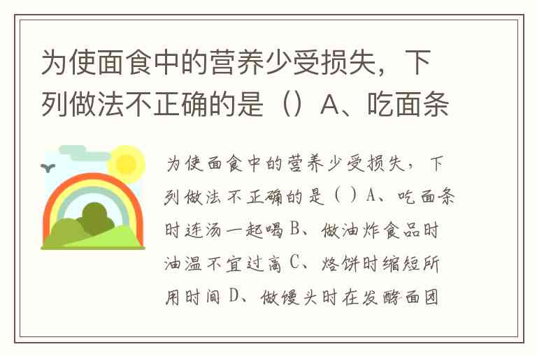 为使面食中的营养少受损失,下列做法不正确的是()A、吃面条时连汤一起喝 B、做油炸食品时油温不宜过高 C、烙饼时缩短所用时间 D、做馒头时在发酵面团中加碱