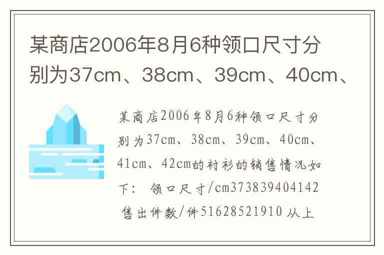 某商店2006年8月6种领口尺寸分别为37cm、38cm、39cm、40cm、41cm、42cm的衬衫的销售情况如下: 领口尺寸/cm373839404142 售出件数/件51628521910 从上面统计表中的数据中我获得的信息有: 。