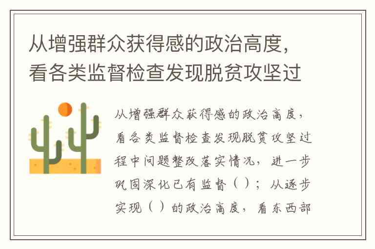 从增强群众获得感的政治高度,看各类监督检查发现脱贫攻坚过程中问题整改落实情况,进一步巩固深化已有监督成效;从逐步实现共同富裕的政治高度,看东西部扶贫协作和中央单位定点扶贫工作开展情况,推动形成全党全社会集中攻坚的强大合力。