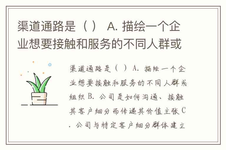 渠道通路是( ) A. 描绘一个企业想要接触和服务的不同人群或组织 B. 公司是如何沟通、接触其客户细分而传递其价值主张 C. 公司与特定客户细分群体建立的关系类型 D. 为特定客户细分创造价值的系列产品和服务