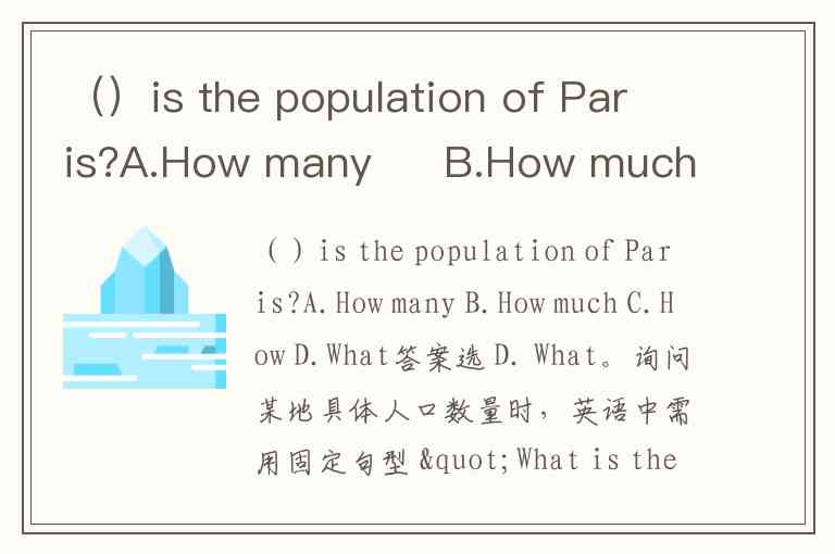这种用法的核心原因是:population 强调的是一个整体数字概念,而非具体的人或事物的数量。正如文档[3]和[8]补充的,若需模糊询问人口规模(而非具体数字),可用 "How large is the population...?",但本题空格后直接接 "is the population of Paris",显然是询问具体数值,因此只能选 What。