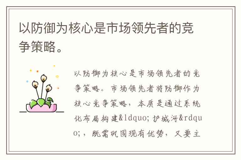 市场领先者将防御作为核心竞争策略,本质是通过系统化布局构建“护城河”,既需巩固现有优势,又要主动塑造竞争规则。这种战略并非被动守成,而是融合军事防御智慧与商业竞争逻辑的动态平衡艺术,正如军事防御中“防御不完全排斥进攻”的原则,商业防御同样需要以守为攻的主动性。