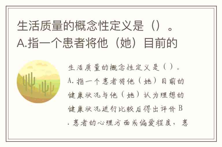 生活质量的概念性定义是()。A.指一个患者将他(她)目前的健康状况与他(她)认为理想的健康状况进行比较后得出评价 B.患者的心理方面或偏爱程度,患者的基本生活或生活状况恢复,或患者的目前现实状况与期望值之间的差距 C.某个人在社会方面、心理及精神方面、职业方面和躯体方面均获得满意的功能状态 D.不同文化和价值体系中的个体对他们在生活中所处位置的感受以及对与他们的目的、期望、标准及所关注的事情有关的生活状况的体验 E.由患者自行评价后确定的生活状态