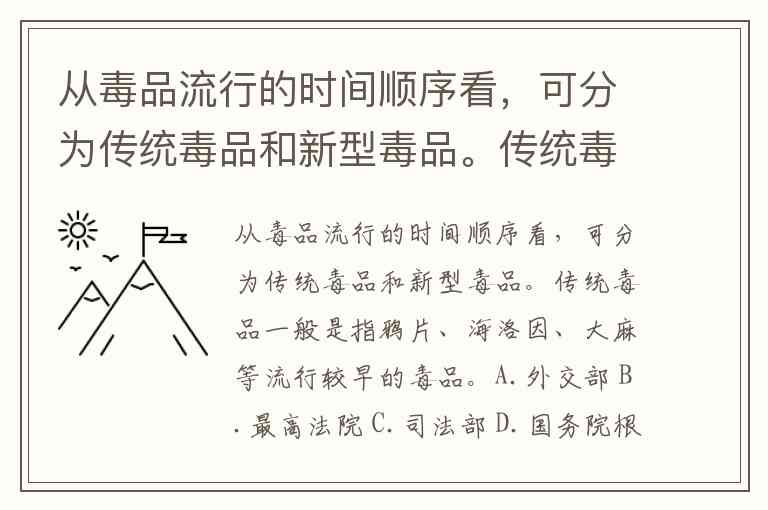 从毒品流行的时间顺序看,可分为传统毒品和新型毒品。传统毒品一般是指鸦片、海洛因、大麻等流行较早的毒品。A.外交部 B.最高法院 C.司法部 D.国务院