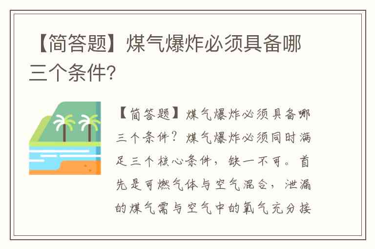煤气爆炸必须同时满足三个核心条件,缺一不可。首先是可燃气体与空气混合,泄漏的煤气需与空气中的氧气充分接触形成可燃混合物;其次是达到爆炸极限浓度,不同来源虽略有差异(通常为1.5%-9.5%或5%-15%),但核心是混合气体浓度处于这一危险区间时才具备爆炸风险;最后是存在点火源,包括明火、电火花、静电或高温等足以引发燃烧的能量来源。