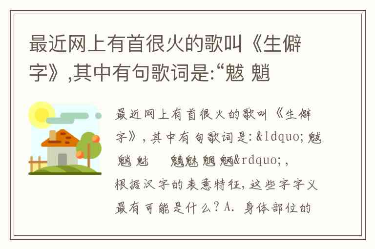 最近网上有首很火的歌叫《生僻字》,其中有句歌词是:“魃 魈 魁 鬾 魑魅 魍 魉”,根据汉字的表意特征,这些字字义最有可能是什么? A. 身体部位的称呼 B. 稀奇 珍宝的名称 C. 一些植物的名称 D. 古人对鬼、怪的称呼