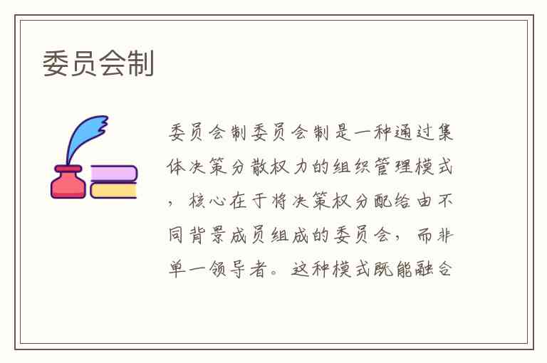 委员会制是一种通过集体决策分散权力的组织管理模式,核心在于将决策权分配给由不同背景成员组成的委员会,而非单一领导者。这种模式既能融合多元视角提升决策质量,又因集体参与可能导致效率损耗,广泛存在于企业治理、政府机构乃至动画制作等专业领域。