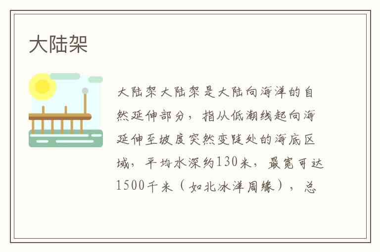大陆架是大陆向海洋的自然延伸部分,指从低潮线起向海延伸至坡度突然变陡处的海底区域,平均水深约130米,最宽可达1500千米(如北冰洋周缘),总面积约2710万平方千米,占海洋面积的7.5%。其地形总体平缓,但可见水下三角洲、阶地、古河谷等地貌,如长江口外的大型水下三角洲和巽他陆架的树枝状沉溺河谷。地质上,大陆架覆盖陆源沉积物(砂、泥等),下伏大陆型地壳,部分区域因沉降形成巨厚沉积盆地,如中国大陆架的中新生代沉积层厚达数千米。
