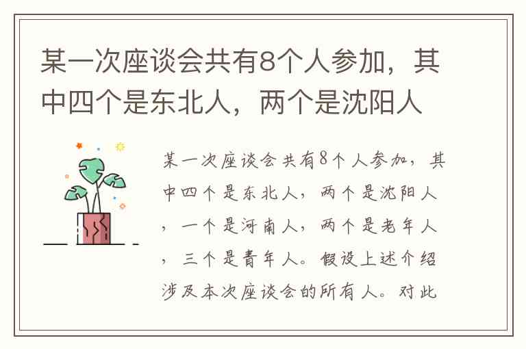 河南人:1人(应该不是东北人,因为东北和河南是不同地区,所以总人数里东北4+河南1=5人,剩下3人可能是其他地区?不过题目说“上述介绍涉及本次座谈会的所有人”,所以可能所有8人都被这些分类覆盖了,但年龄和地区是不同的分类维度,所以地区分类(东北4+河南1)共5人,剩下3人是什么?可能题目中的“上述介绍”包括地区(东北、沈阳、河南)和年龄(老年、青年),但沈阳属于东北,所以地区维度是东北4人(含沈阳2)+河南1人=5人,那么剩下3人可能是其他地区的人?不过题目说“涉及所有人”,可能这些分类的并集是8人,但需要考虑重叠。