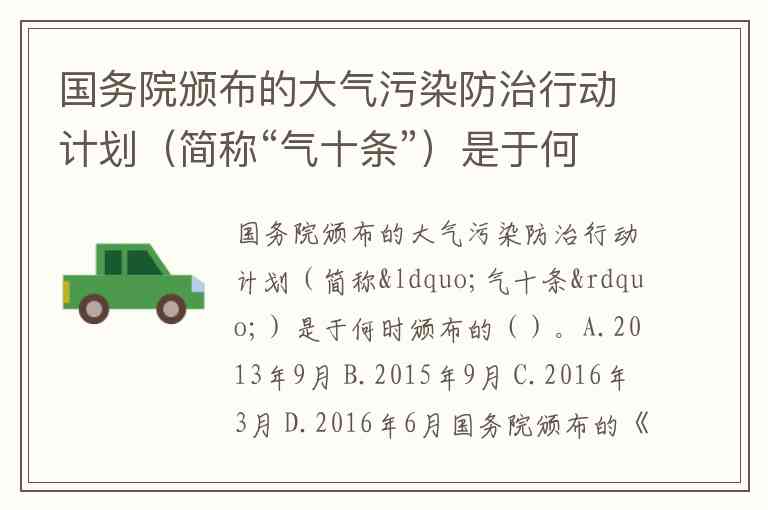 国务院颁布的大气污染防治行动计划(简称“气十条”)是于何时颁布的()。A.2013年9月 B.2015年9月 C.2016年3月 D.2016年6月