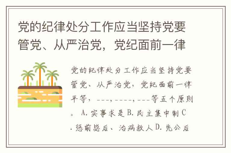党的纪律处分工作应当坚持党要管党、从严治党,党纪面前一律平等,___,____,___等五个原则。 A.实事求是 B.民主集中制 C.惩前毖后、治病救人 D.先公后私、克己奉公A.实事求是 B.民主集中制 C.惩前毖后、治病救人 D.先公后私、克己奉公