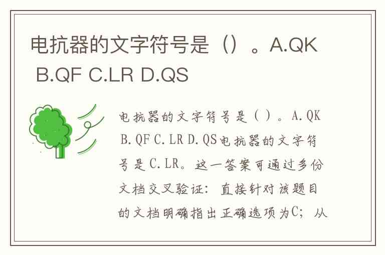 电抗器的文字符号是 C.LR。这一答案可通过多份文档交叉验证:直接针对该题目的文档明确指出正确选项为C;从基础符号定义看,文档[1][5][6][8]均提到电抗器的核心符号为“L”(电感/电抗线圈),而“LR”是其常见组合形式(L表示电感特性,R可理解为限流或电阻特性的补充)。