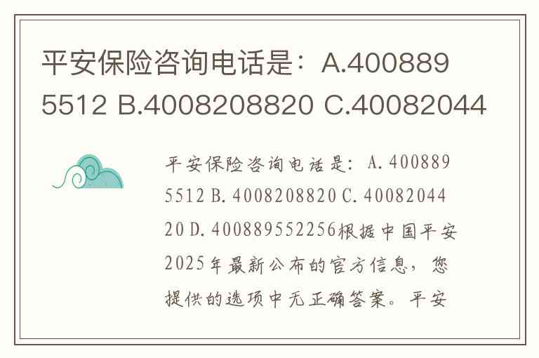 平安保险咨询电话是:A.4008895512 B.4008208820 C.4008204420 D.400889552256