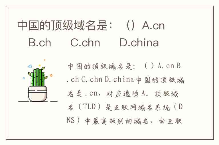 中国的顶级域名是:()A.cn B.ch C.chn D.china