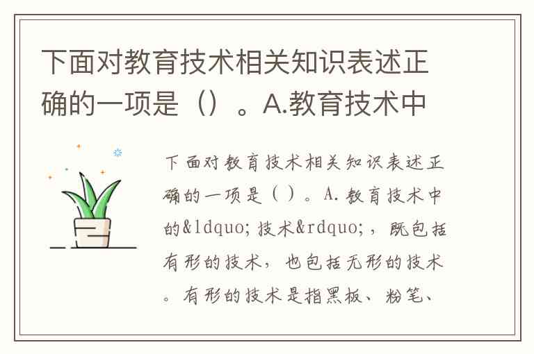 下面对教育技术相关知识表述正确的一项是()。A.教育技术中的“技术”,既包括有形的技术,也包括无形的技术。有形的技术是指黑板、粉笔、投影、视听教材等传统教学媒体 B.教育技术以信息技术为基本工具和手段,以达到教学效果的最优化为目的 C.教育技术是以学习过程和学习资源为主要研究对象,使用最先进的技术手段优化教学过程以提高效果 D.教育技术和信息技术的名称不同,但是它们的涵义基本相同,都是应用在教育领域的先进技术