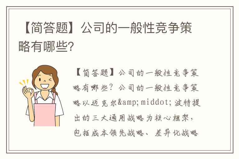 公司的一般性竞争策略以迈克尔·波特提出的三大通用战略为核心框架,包括成本领先战略、差异化战略和集中战略,这些策略通过应对行业五大竞争力(供应商议价能力、购买者议价能力、潜在竞争者进入能力、替代品替代能力、行业内竞争能力)帮助企业建立长期竞争优势。