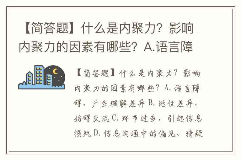 【简答题】什么是内聚力?影响内聚力的因素有哪些?A.语言障碍,产生理解差异 B.地位差异,妨碍交流 C.环节过多,引起信息损耗 D.信息沟通中的偏见、猜疑、威胁和恐惧,妨碍沟通 E.信息表达不清,沟通要求不明,渠道不畅