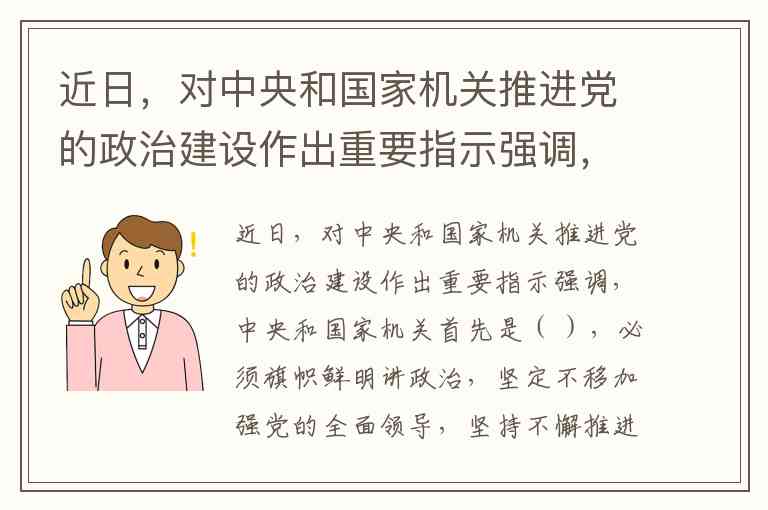 近日,对中央和国家机关推进党的政治建设作出重要指示强调,中央和国家机关首先是( ),必须旗帜鲜明讲政治,坚定不移加强党的全面领导,坚持不懈推进党的政治建设。 A. 政治机关 B. 行政机关 C. 领导机构