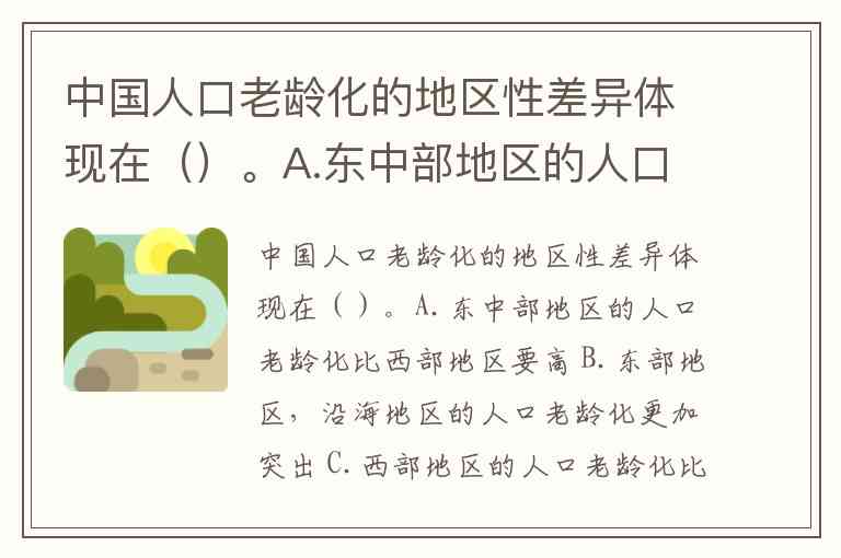 中国人口老龄化的地区性差异体现在()。A.东中部地区的人口老龄化比西部地区要高 B.东部地区,沿海地区的人口老龄化更加突出 C.西部地区的人口老龄化比东中部地区要高 D.智慧养老在各个地方的推进进程不一样