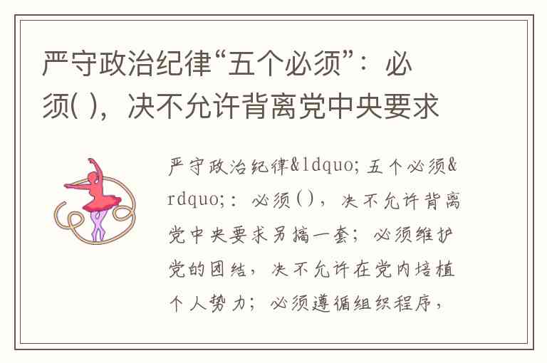 需要注意的是,“五个必须”在不同领域有特定表述,例如中央经济工作会议曾提出关于经济工作的“五个必须”,公安机关也有队伍建设的“五个必须”。但就政治纪律范畴而言,用户问题中的空白处唯一正确答案是“维护党中央权威”,这一表述在权威文献中具有明确指向性和不可替代性。
