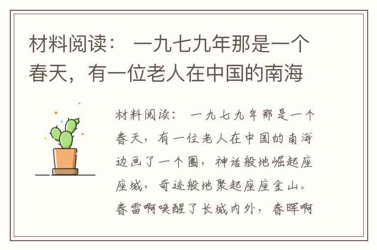 材料阅读: 一九七九年那是一个春天,有一位老人在中国的南海边画了一个圈,神话般地崛起座座城,奇迹般地聚起座座金山。春雷啊唤醒了长城内外,春晖啊暖透了大江两岸。啊,中国,啊,中国,你迈开了气壮山河的新步伐,你迈开了气壮山河的新步伐,走进万象更新的春天。 ──《春天的故事》 结合材料回答: ①材料中一九七九年的“春天”喻指什么?“有一位老人”指的是谁? ②他划出这个“圈”指的是什么?当时在广东划的“圈”里有哪几座城市? ③这个“圈”体现了中国的什么政策?这个政策是我党在哪一年召开的哪次会议中做出的决定? ④有人认为上述政策的实行便利了外国企业抢国市场,使外国列强在战场上没有得到的东西几乎都得到了,因此这种政策的实施弊大于利。你是否同意他的观点?说明理由。