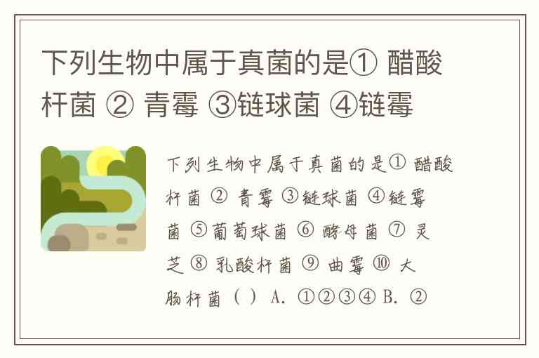 要准确区分题目中的真菌,关键在于掌握细菌与真菌的核心差异:真菌是具有成形细胞核、细胞壁含几丁质的真核生物,而细菌是无核膜包被、细胞壁含肽聚糖的原核生物。从名称规律看,细菌名称常含“球、杆、弧、螺旋”等形态描述词,如“杆菌”“球菌”,而真菌名称无此类特征。
