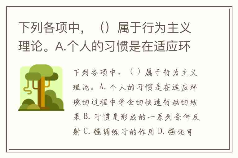 下列各项中,()属于行为主义理论。A.个人的习惯是在适应环境的过程中学会的快速行动的结果 B.习惯是形成的一系列条件反射 C.强调练习的作用 D.强化可以塑造儿童的行为