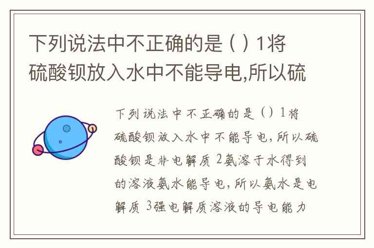 下列说法中不正确的是 ( ) 1将硫酸钡放入水中不能导电,所以硫酸钡是非电解质 2氨溶于水得到的溶液氨水能导电,所以氨水是电解质 3强电解质溶液的导电能力一定比弱电解质溶液的导电能力 A. ① B. ①② C. ①②③ D. ①③