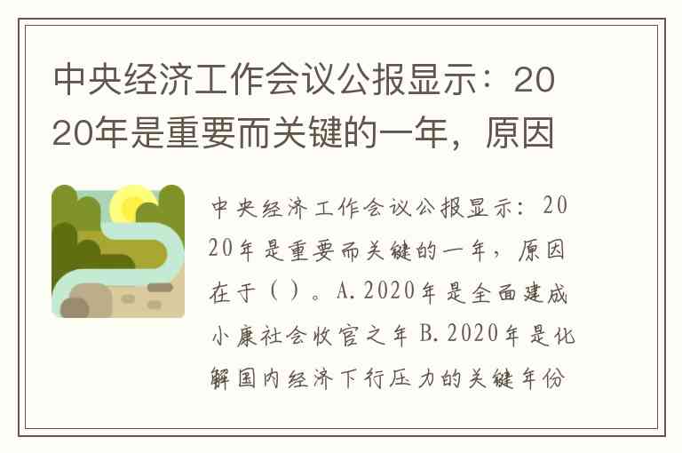 中央经济工作会议公报显示:2020年是重要而关键的一年,原因在于()。A.2020年是全面建成小康社会收官之年 B.2020年是化解国内经济下行压力的关键年份 C.2020年是十三五规划收官之年 D.2020年是从实现第一个百年目标向第二个百年目标迈进的承上启下之年 E.2020年是十三五规划收官之年,也是十四五规划的开局之年