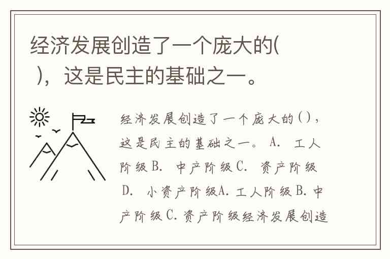 经济发展创造了一个庞大的( ),这是民主的基础之一。 A.工人阶级 B.中产阶级 C.资产阶级 D.小资产阶级A.工人阶级 B.中产阶级 C.资产阶级