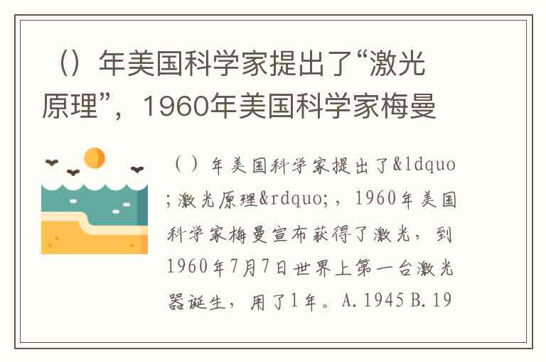 ()年美国科学家提出了“激光原理”,1960年美国科学家梅曼宣布获得了激光,到1960年7月7日世界上第一台激光器诞生,用了1年。A.1945 B.1952 C.1958