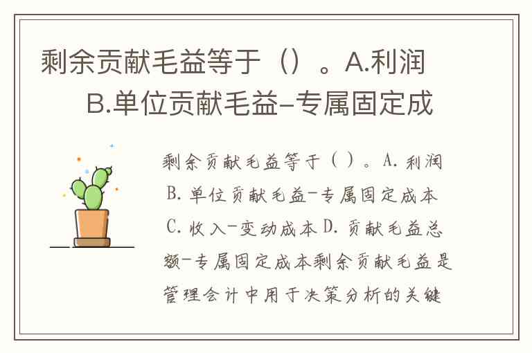 剩余贡献毛益等于()。A.利润 B.单位贡献毛益-专属固定成本 C.收入-变动成本 D.贡献毛益总额-专属固定成本