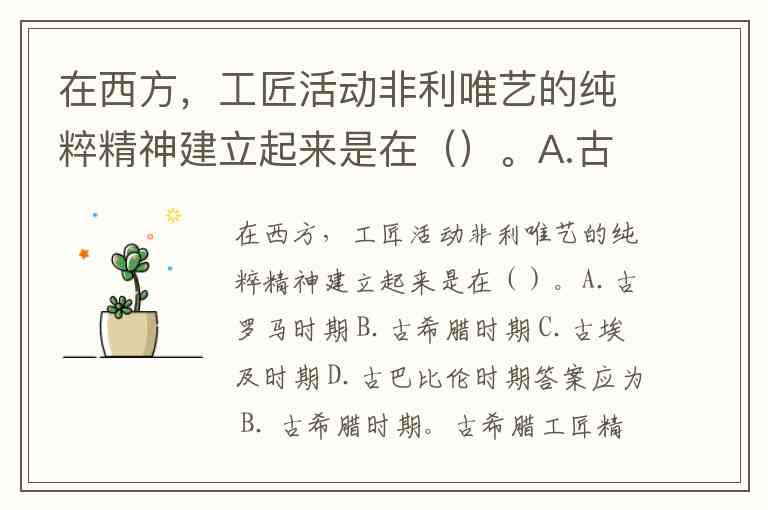 在西方,工匠活动非利唯艺的纯粹精神建立起来是在()。A.古罗马时期 B.古希腊时期 C.古埃及时期 D.古巴比伦时期