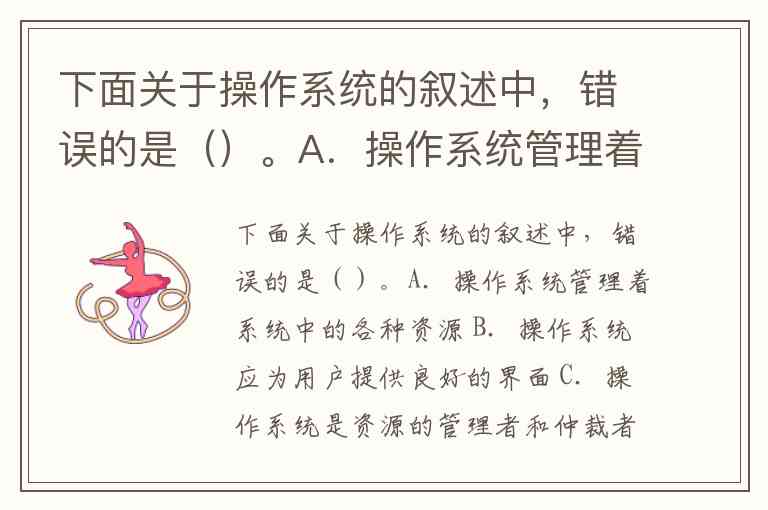 下面关于操作系统的叙述中,错误的是()。A.操作系统管理着系统中的各种资源 B.操作系统应为用户提供良好的界面 C.操作系统是资源的管理者和仲裁者 D.操作系统是计算机系统中的一个应用软件