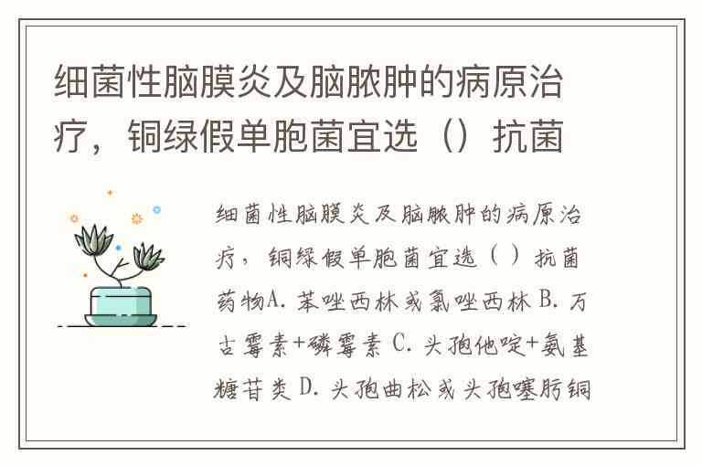 细菌性脑膜炎及脑脓肿的病原治疗,铜绿假单胞菌宜选()抗菌药物A.苯唑西林或氯唑西林 B.万古霉素+磷霉素 C.头孢他啶+氨基糖苷类 D.头孢曲松或头孢噻肟
