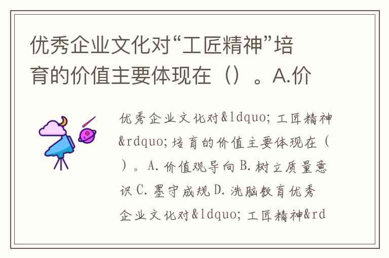 优秀企业文化对“工匠精神”培育的价值主要体现在()。A.价值观导向 B.树立质量意识 C.墨守成规 D.洗脑教育