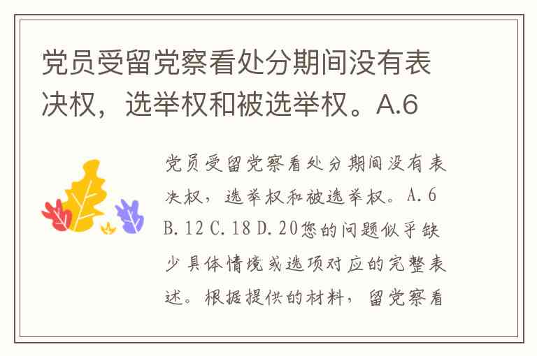 您的问题似乎缺少具体情境或选项对应的完整表述。根据提供的材料,留党察看处分分为一年和二年两个档次,期间党员均无表决权、选举权和被选举权,最长察看期限不超过二年。若问题涉及察看期限选项,正确答案应为留党察看一年(12个月)或二年(24个月),但选项中未出现24个月。结合标准处分档次,最可能的正确选项是 B.12(对应留党察看一年的基础期限)。