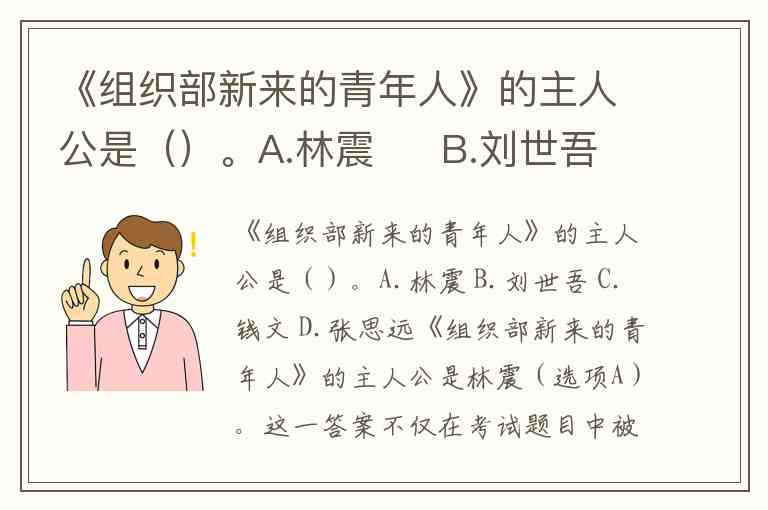 《组织部新来的青年人》的主人公是林震(选项A)。这一答案不仅在考试题目中被明确标注为标准答案,更贯穿于小说的叙事核心——故事以林震从小学教师调任区委组织部的经历为主线,通过他的视角揭露官僚主义弊病,展现理想主义与现实的碰撞。