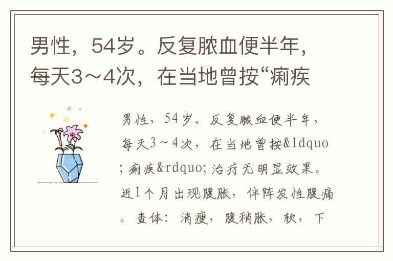 男性,54岁。反复脓血便半年,每天3~4次,在当地曾按“痢疾”治疗无明显效果。近1个月出现腹胀,伴阵发性腹痛。查体:消瘦,腹稍胀,软,下腹轻压痛,右下腹可扪及一肿块,质较硬,尚可活动。首选的辅助检查 A. 纤维结肠镜检查 B. B超 C. 钡餐检查 D. 大便细菌培养 E. CT