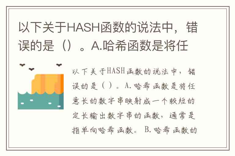 A 正确:哈希函数核心是单向映射,输入任意长、输出固定长。