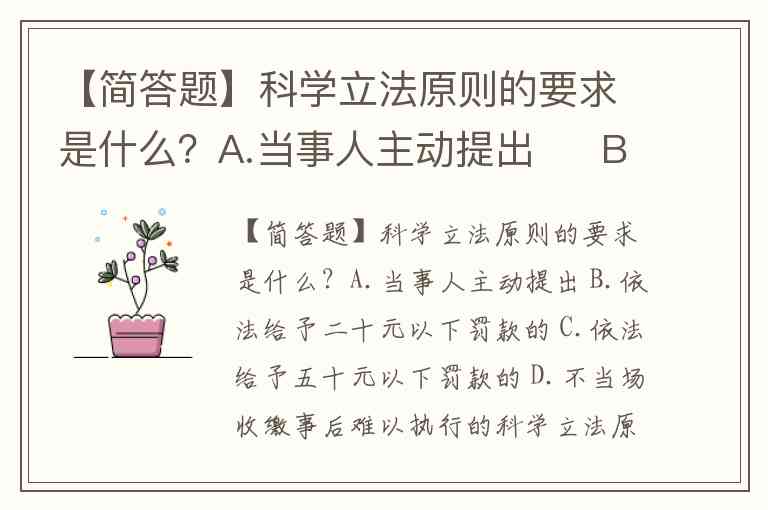 【简答题】科学立法原则的要求是什么?A.当事人主动提出 B.依法给予二十元以下罚款的 C.依法给予五十元以下罚款的 D.不当场收缴事后难以执行的