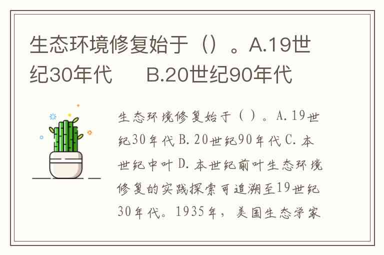 生态环境修复始于()。A.19世纪30年代 B.20世纪90年代 C.本世纪中叶 D.本世纪前叶