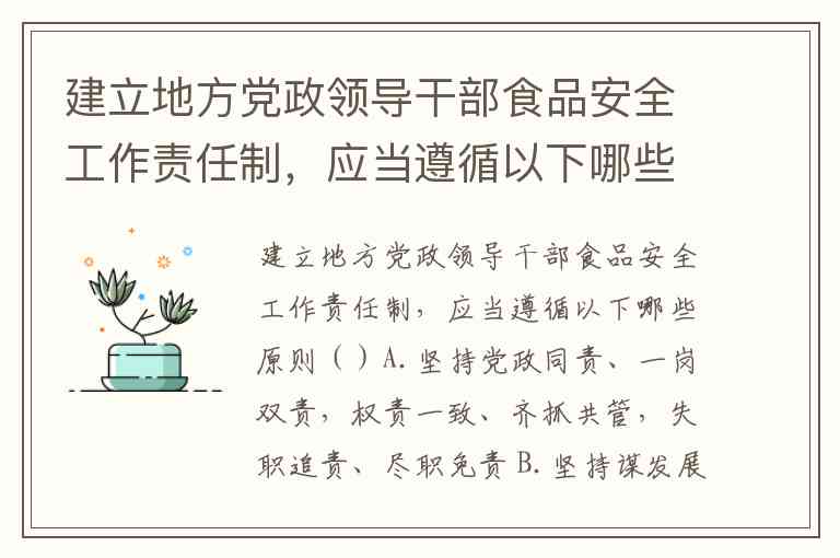 建立地方党政领导干部食品安全工作责任制的核心原则在《地方党政领导干部食品安全责任制规定》中明确体现,这些原则构建了"权责一致、层层落实"的责任体系。根据规定,正确选项为 A、B、C,具体依据如下: