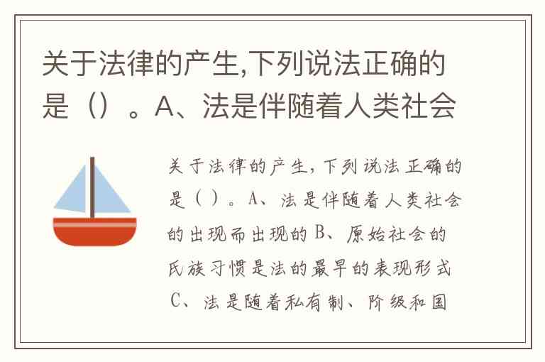 关于法律的产生,下列说法正确的是()。A、法是伴随着人类社会的出现而出现的 B、原始社会的氏族习惯是法的最早的表现形式 C、法是随着私有制、阶级和国家的产生而产生的 D、法律完全是阶级斗争的产物,而不是出于调整经济关系的需要