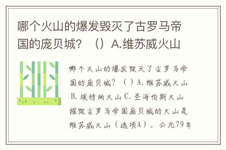 哪个火山的爆发毁灭了古罗马帝国的庞贝城?()A.维苏威火山 B.埃特纳火山 C.圣海伦斯火山