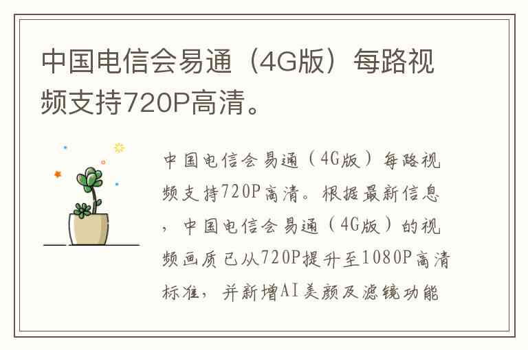 根据最新信息,中国电信会易通(4G版)的视频画质已从720P提升至1080P高清标准,并新增AI美颜及滤镜功能以优化会议形象。这一升级不仅改善了视频清晰度,还通过智能图像处理技术增强了用户在远程会议中的视觉呈现效果。当前版本是否仍保留720P选项,或已完全升级为1080P默认配置,具体可咨询运营商获取详细参数。